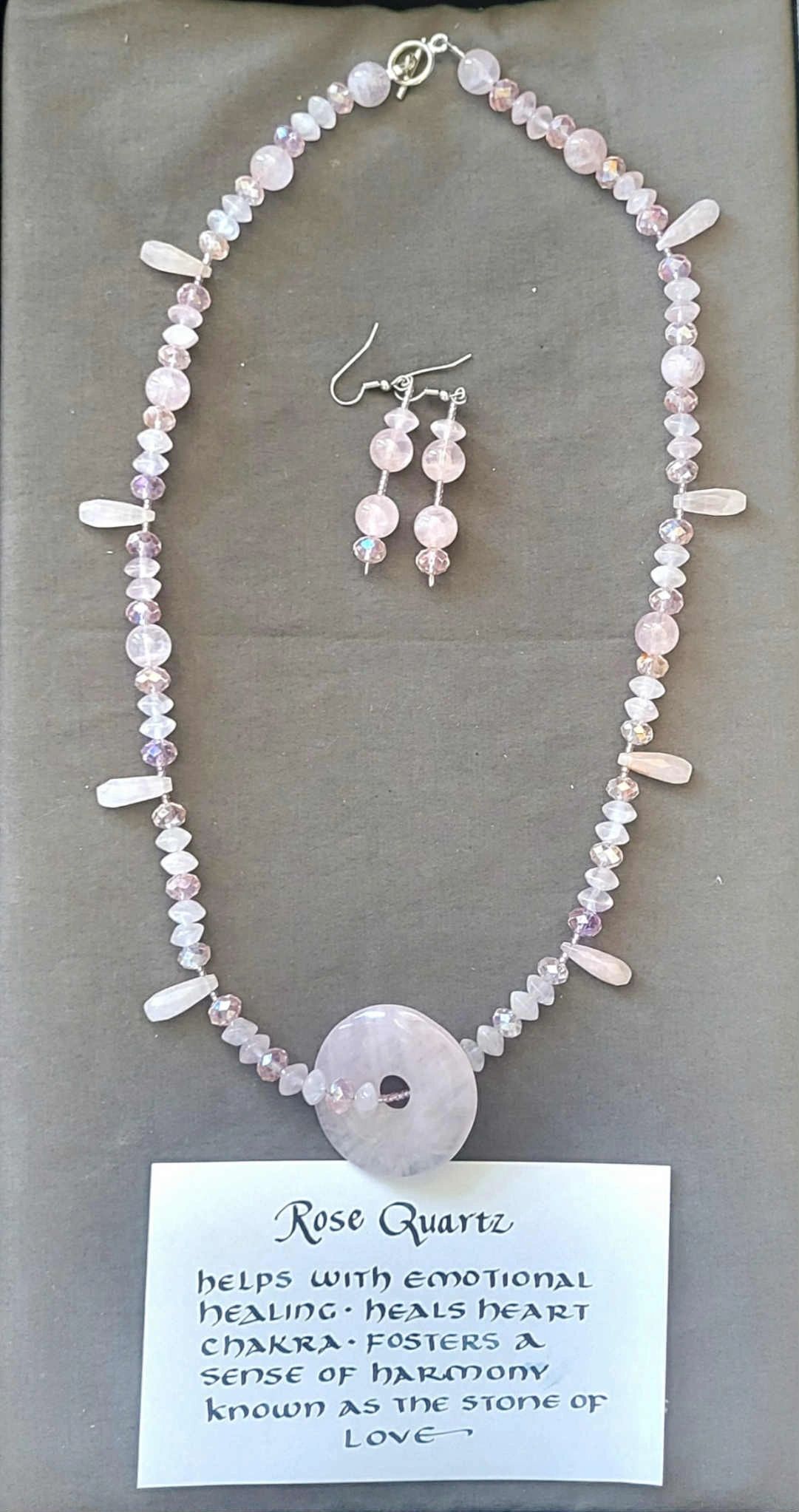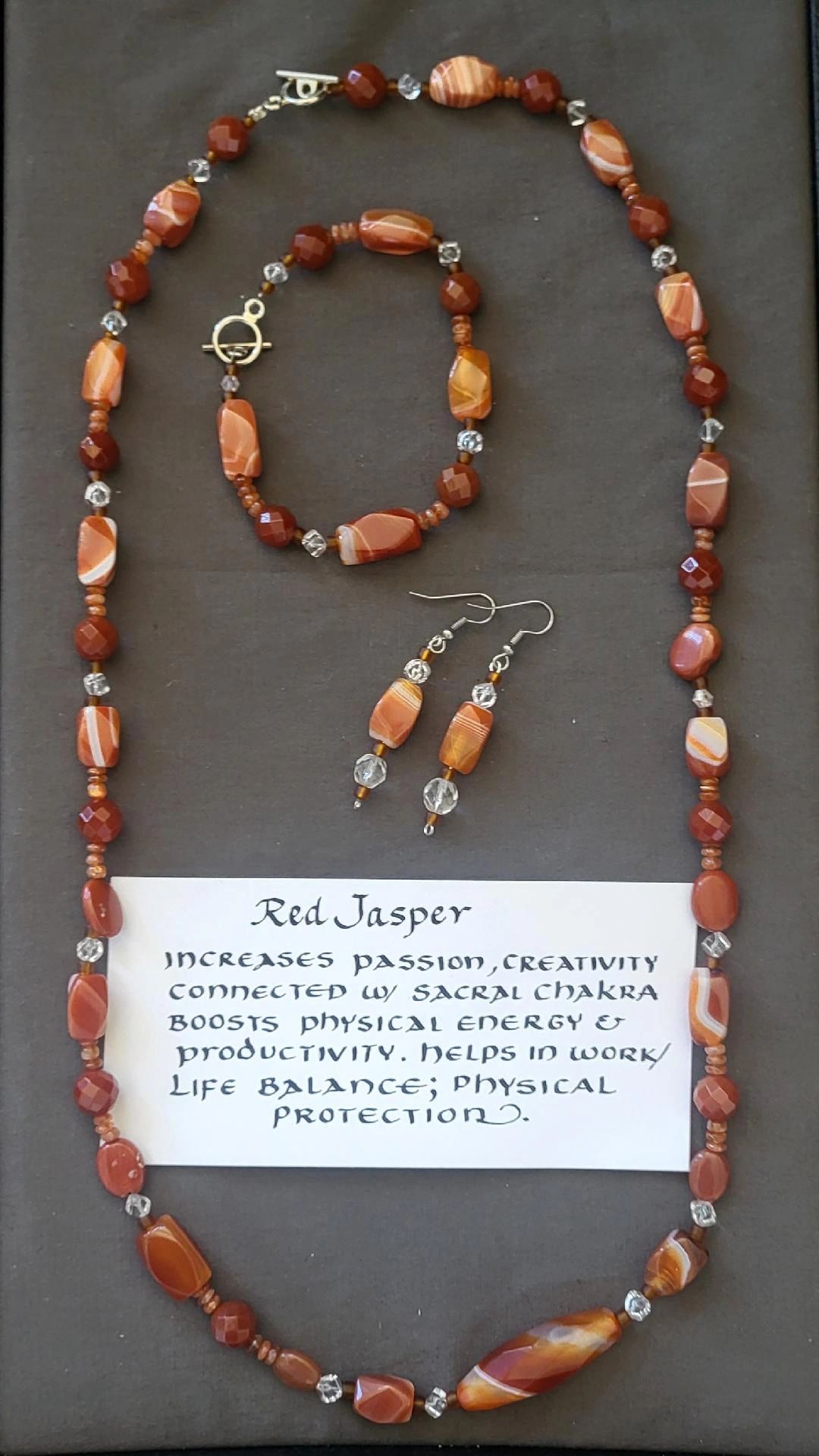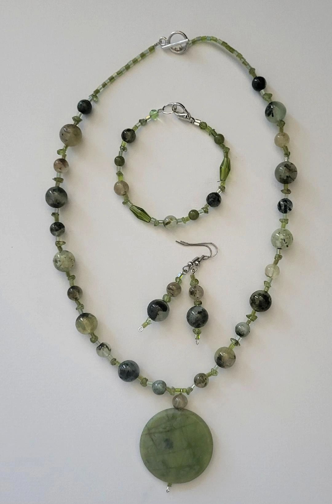 Semi-precious stones, believed to be good for healing and protection. Ten inch hanging length with earrings. Tourmaline with Czech glass beads. Price $125 including shipping.