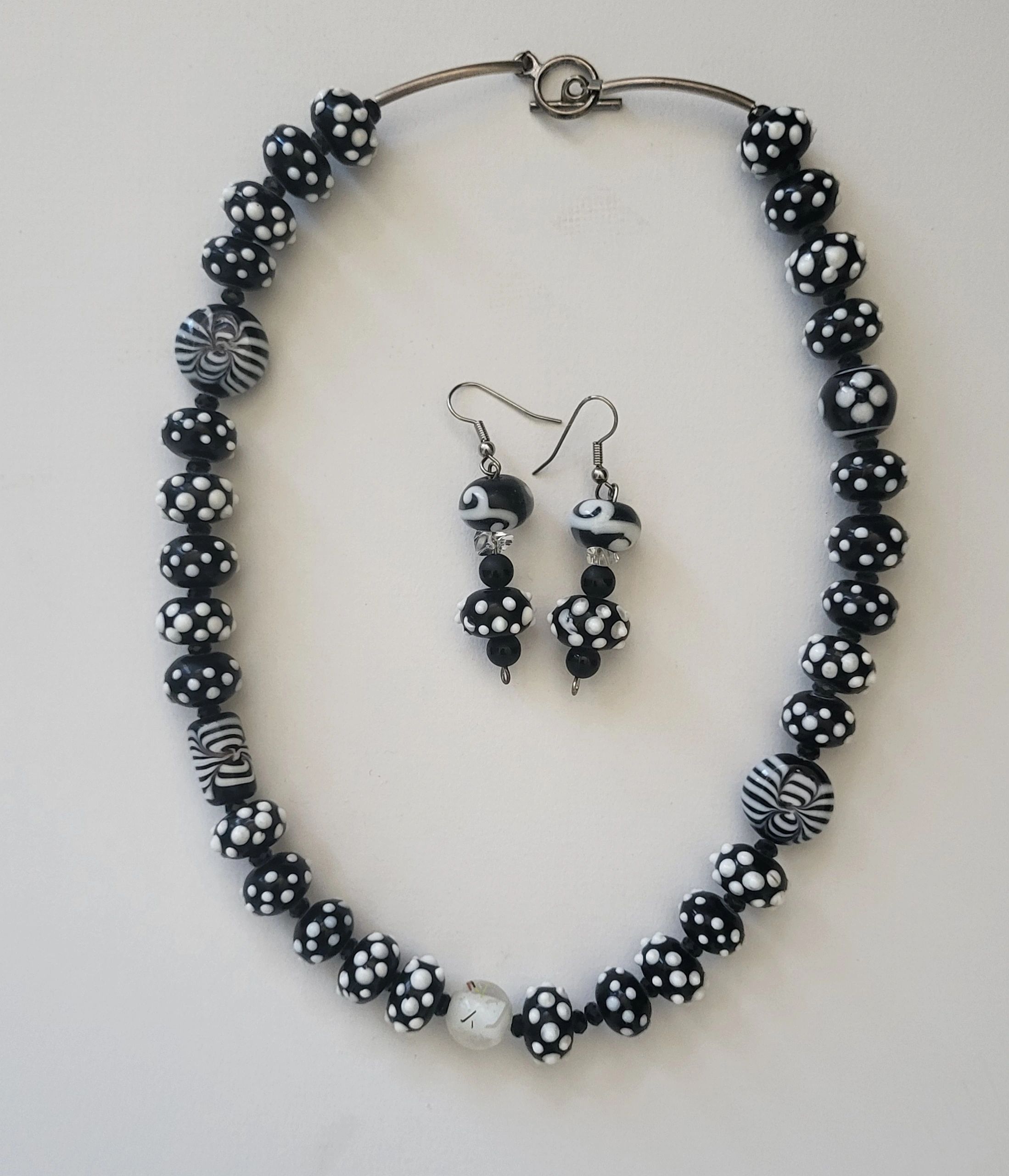 Black and white glass beaded set can add style with any color you wear. Nine inch hanging length with ear rings. "One of a kind set."