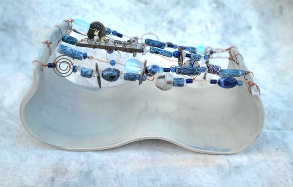 coins, "found art" decorations, handmade beads and other tidbits from the artist's studio, all mounted on copper wire. It all ties onto the mystery wave of this pale blue porcelain sculpture. Price $245 includes shipping